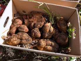 Keni Piahana harvests purple and gold kūmara from one of the mounds designated for koha