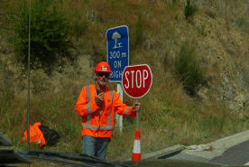 Stop go -- Stop/go personnel are a fixture along 100km of damaged highway