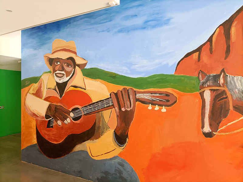 Detail of Vincent Namatjira's work, "Past-Present-Future", 2021, displayed on foyer wall of Museum of Contemporary Art, Sydney. (PHOTO: Kennedy Warne)