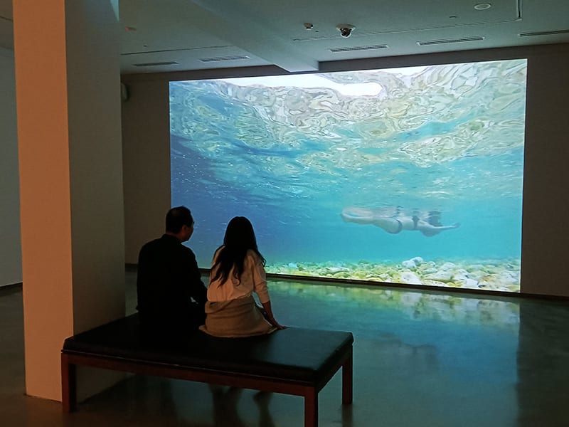 "Lick" 2015, a video work by Angela Tiatia about trying to maintain a foothold on the seabed in Tuvalu as sea level rises. Part of the "Perspectives on Place" exhibition at Museum of Contemporary Art, Sydney. (PHOTO: Kennedy Warne)