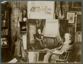 Louis John Steele in his studio with his portrait of Sir John Logan Campbell at Kilbryde, black and white photograph from Campbell’s unpublished “My autobiography”, 1904-7, Campbell papers, Cornwall Park Trust on deposit Auckland War Memorial Museum.