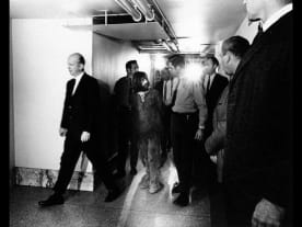 "Manson is led from court after deferring a plea to the murder charges against him. He is wearing the buckskin outfit made for him by Family women." Credit: Courtesy of the Photo Collection at the Los Angeles Public Library