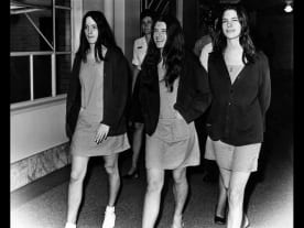 "Left to right: Susan Atkins, Patricia Krenwinkel, and Leslie Van Houten on their way to court on August 11, 1970. Each woman gouged an X onto her forehead in imitation of Manson, who had previous carved an X onto his." Credit: Courtesy of the Photo Collection at the Los Angeles Public Library