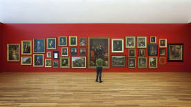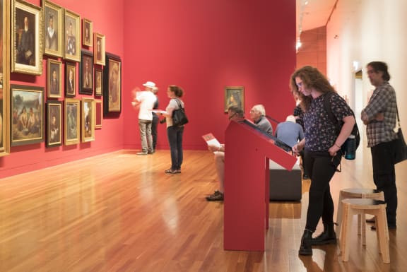 Toi Art portrait wall room with audience, 2018. Photograph by Kate Whitley. Te Papa