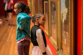 Children examine the portrait wall in Tuangawaewae Art and New Zealand, 2018. Photograph by Jo Moore. Te Papa