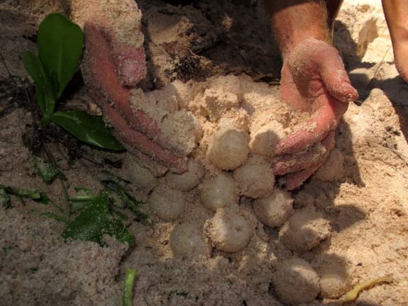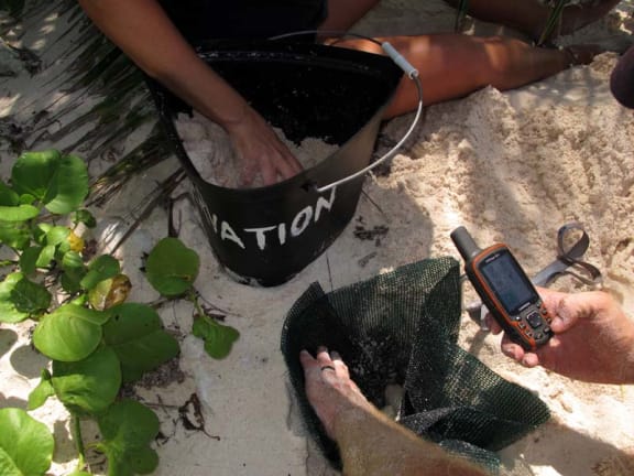 On Cousine Island, conservation managers excavate a nest and relocate a clutch of eggs to a safer site.