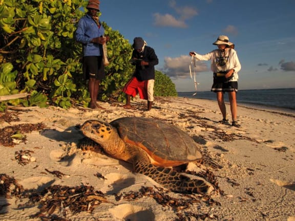 Turtle researchers watch a hawksbill turtle that has just laid its cluth of eggs on D'Arros.