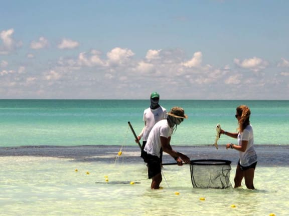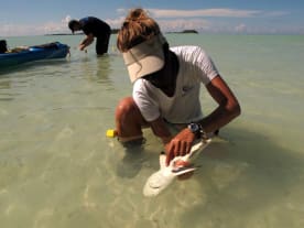 Swiss shark researcher Ornella Weideli lifts a juvenile lemon shark from the net. It will be given an acoustic tag and tracked as it grows in the lagoon.
