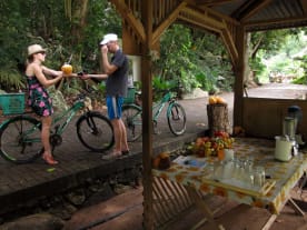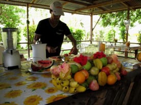 La Digue, a popular tourist destination, is renowned for its range of fruits. A stall offers drinks and fruit.