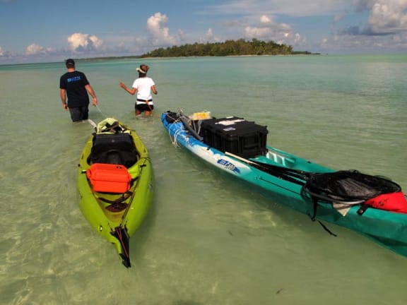 Walking the vast shallow lagoon of St Joseph to a shark-catching site.