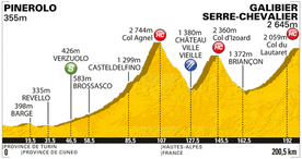 France 2013: the stage profile of the 2011 route from Pinerolo in Italy back into France - a long climb starting at about 300m above sea level, and topping out at 2744m 75km later!