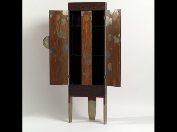 Koloman MOSER (designer) Austria 1868–1918 PORTOIS & FIX, Vienna (manufacturer) Austria est. 1881 The enchanted princesses, corner cabinet 1900 padouk wood, nickel plated white metal, copper, glass 171.0 x 53.0 x 33.0 cm Private collection, Portola