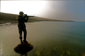 Devon Island, Nunavut, Canada. A Canadian soldier stands guard at the edge of the Northwest Passage, an emerging shipping lane as the Arctic melts.