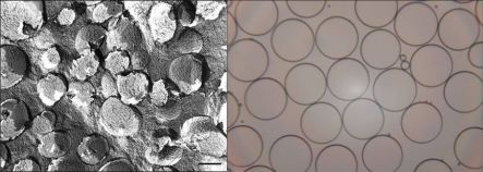 Above right: Example of an emulsion prepared in a much more controlled manner using a microfluidic device. This allows droplets of almost identical size to be produced. This allows for the exploration of the fundamental physics of these systems more straightforwardly than in the type samples on the left, where the different droplet sizes complicate the analysis.