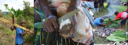 A farmer carrying taro and sugarcane; the poisonous outer skin of taro being peeled off; and cooking taro and other food wrapped in banana leaves in a ground oven. (images: Peter Matthews)