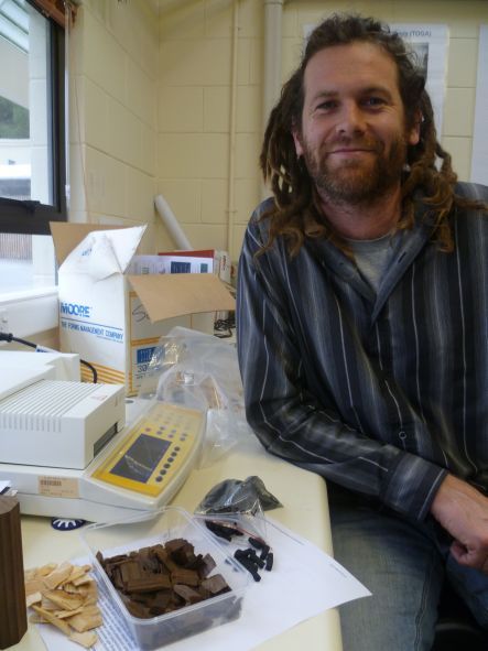 George Escourt, with samples of woody biomass - the light brown chips in the middle have been through the torrefaction process (image: A. Ballance)
