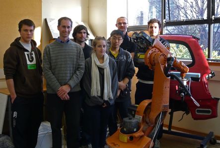 The fuel robot and friends, from left to right, Andrew Lewis, Chris Hann, Julian Pipe, Kirstin Middelkoop, Jermin Tiu, Duncan Scott and Samuel Sanson (image: V Meduna)