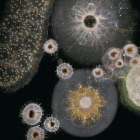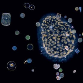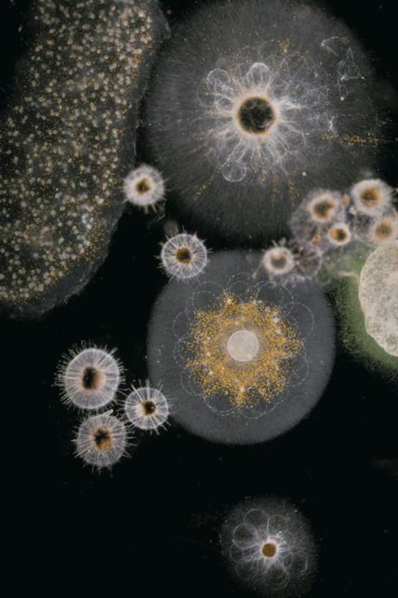 Radiolarians are protists – unicellular creatures - that often live in symbiosis with algae, visible here as tiny ocre-colored dots. On the top left is a colonial radiolarian. Christian Sardet, 'Plankton – Wonders of the Drifting World', Univ. Chicago Press 2015