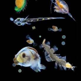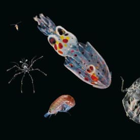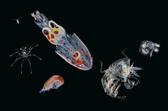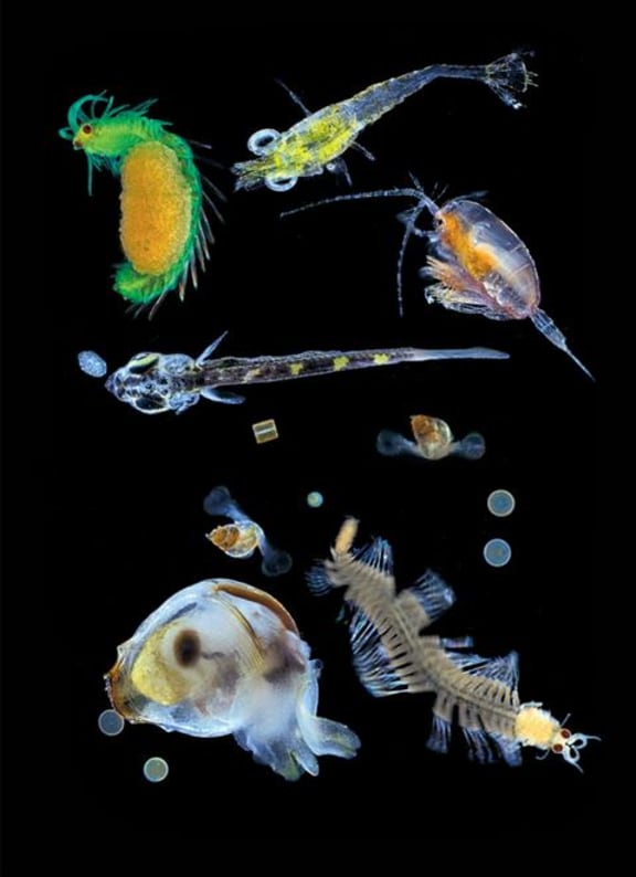 Common zooplanktonic creatures are displayed together here. From left to right: a tiny crustacean copepod, a spider crab larva, an amphipod, a baby squid, a Phronima amphipod, and an Atlanta pteropod mollusc. Christian Sardet, 'Plankton – Wonders of the Drifting World', Univ. Chicago Press 2015