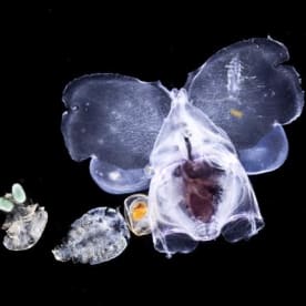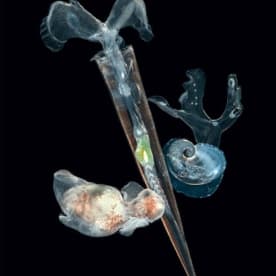 Three different pteropod molluscs. The two in the back have fragile calcareous shells. They are natural prey for the third species (in front) which does not have a shell. Christian Sardet, 'Plankton – Wonders of the Drifting World', Univ. Chicago Press 2015