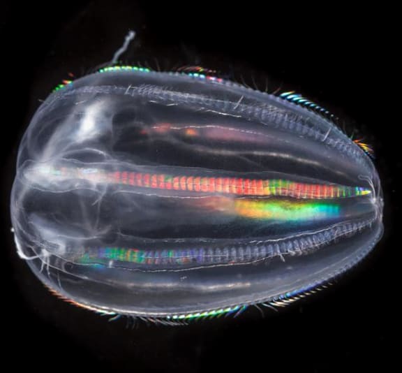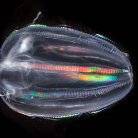 Ctenophores move using 8 iridescent rows of comb plates. This juvenile specimen was collected in the Mediterranean Sea.