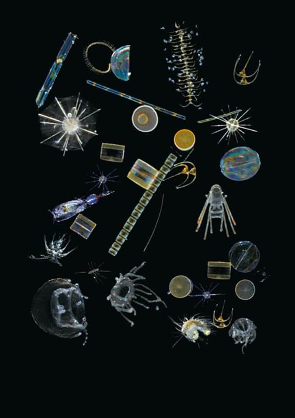 This is a mixture of single cell protists – diatoms, dinoflagellates, radiolarians and foraminiferans. Christian Sardet, 'Plankton – Wonders of the Drifting World', Univ. Chicago Press 2015