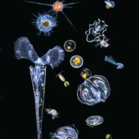 Here we see a mixture of single cell protists – diatoms, dinoflagellates, and foraminiferans – surrrounding a colony of radiolarians in the center. Christian Sardet, 'Plankton – Wonders of the Drifting World', Univ. Chicago Press 2015