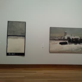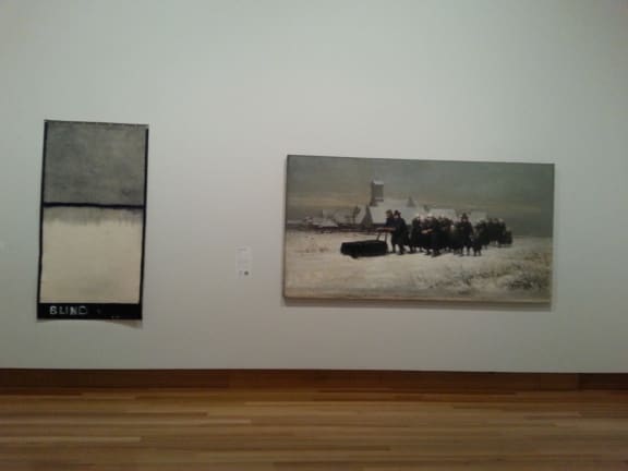 Installation view of Petrus van der Velden, The Dutch funeral, 1875. Oil on canvas, gifted by Henry Charles Drury van Asch, 1932 AND Colin McCahon, Blind V. Synthetic polymer paint on unstretched canvas, purchased 1975. Reproduced courtesy of Colin McCahon Research and Publication Trust. From the exhibition, McCahon / Van der Velden (18 December 2015 to 29 February 2016).