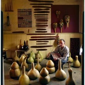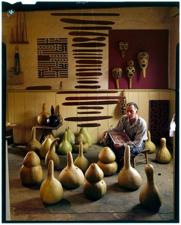 Theo Schoon in his house at Home Street in 1962, surrounded by gourds, a sculpture made from driftwood collected at Taupō, gourd puppets and painted panels. Photograph by Bernie Hill. Hocken Library, MS-1294/011.