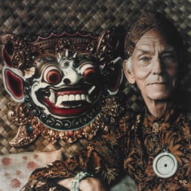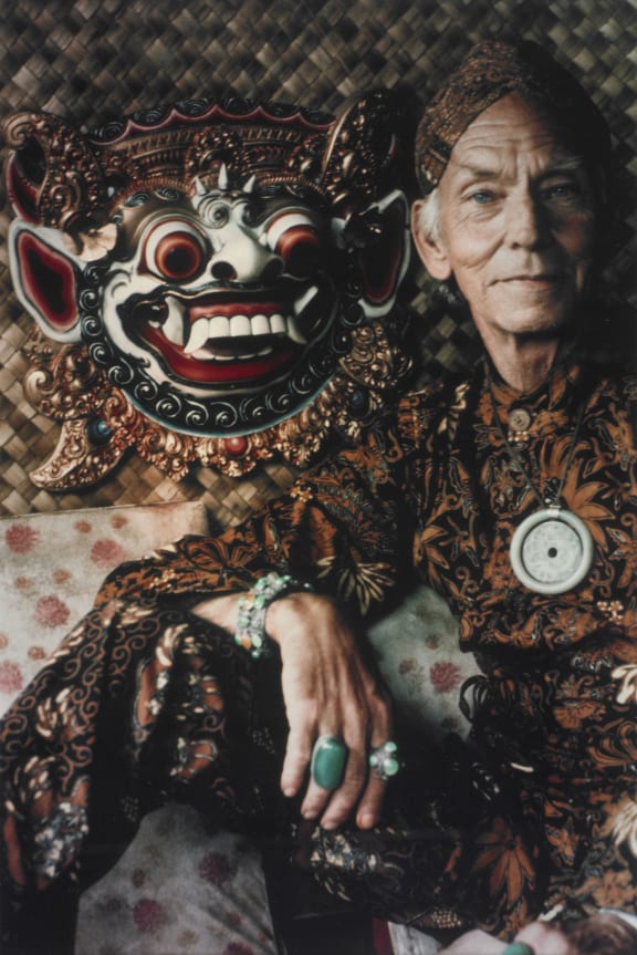 Schoon, in clothing of his own design made from batik cloth, poses with a mask of Rangda, processed July 1978. Photograph by Theo Schoon. Te Papa Tongarewa, CA000841/001/0045.