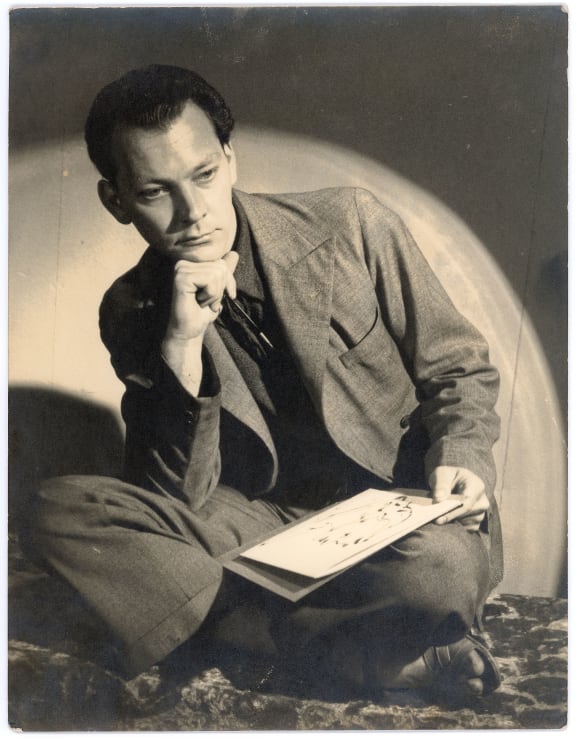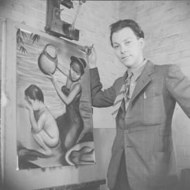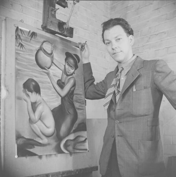 Schoon with one of his Beautiful-Indies paintings in his basement studio in the Wellington YMCA, circa 1942. Te Papa Tongarewa, CA000841/001/0047