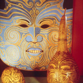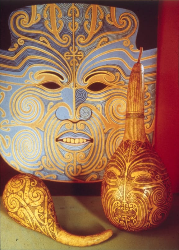 Gourds decorated with designs based on tā moko patterns were Schoon’s first experiments in gourd carving. Quite often he would display them against backdrops painted with patterns based on tā moko or kōwhaiwhai. Photograph by Theo Schoon, circa 1960. Te Papa Tongarewa, CA000840/001/0048.