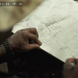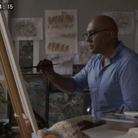 Michel Tuffery in studio creating drawings to be animated for Tupaia's Endeavour - Image courtesy of Lala Rolls, Director,