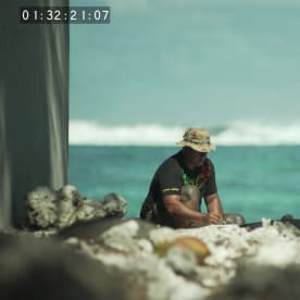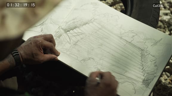Michel Tuffery sketching at ma'atea marae in Tahiti, the last one built by Tupaia - Image courtesy of Lala Rolls, Director, Tupaia's Endeavour