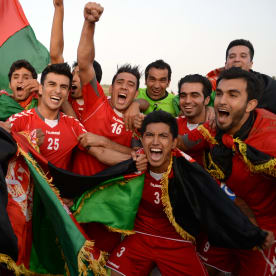 Afghan footballers celebrate 3-0 win against Pakistan, Kabul, 2013. (PHOTO: Massoud Hossaini/AFP)