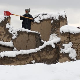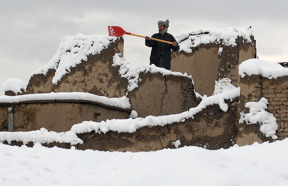 An Afghan man clears the snow from the roof of his house, Kabul, 2008. (PHOTO: Massoud Hossaini/AFP)