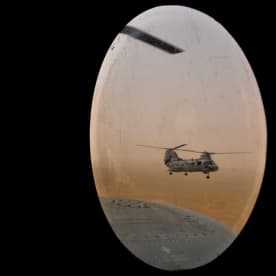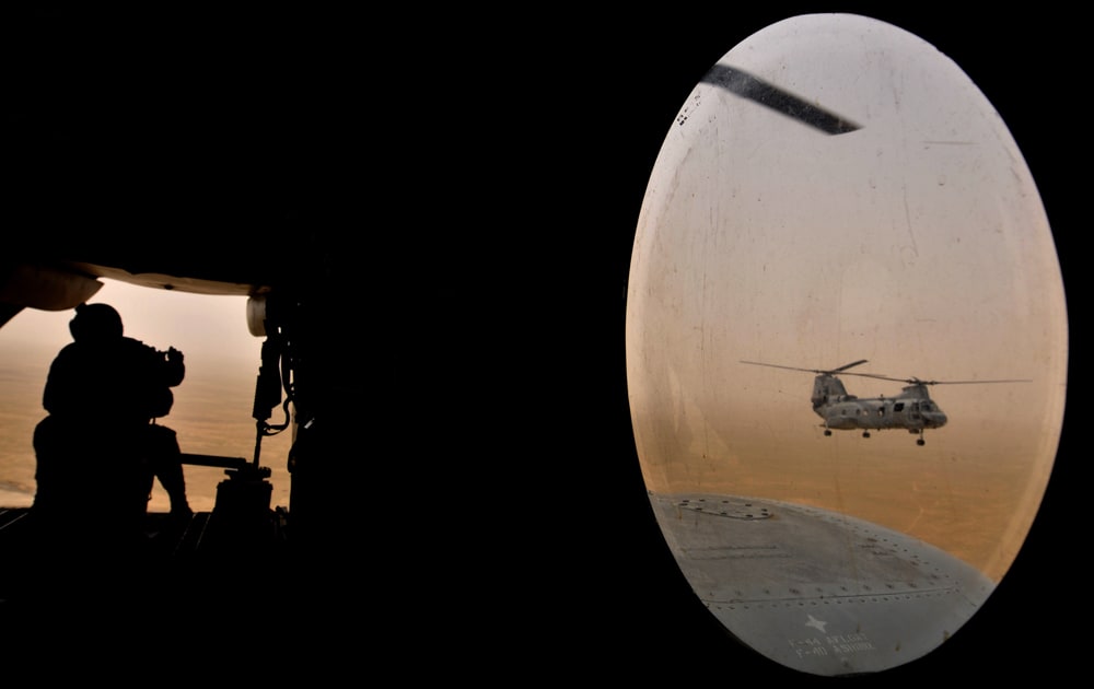 In a Marine Shinook helicopter, 2008. (PHOTO: Massoud Hossaini/AFP)
