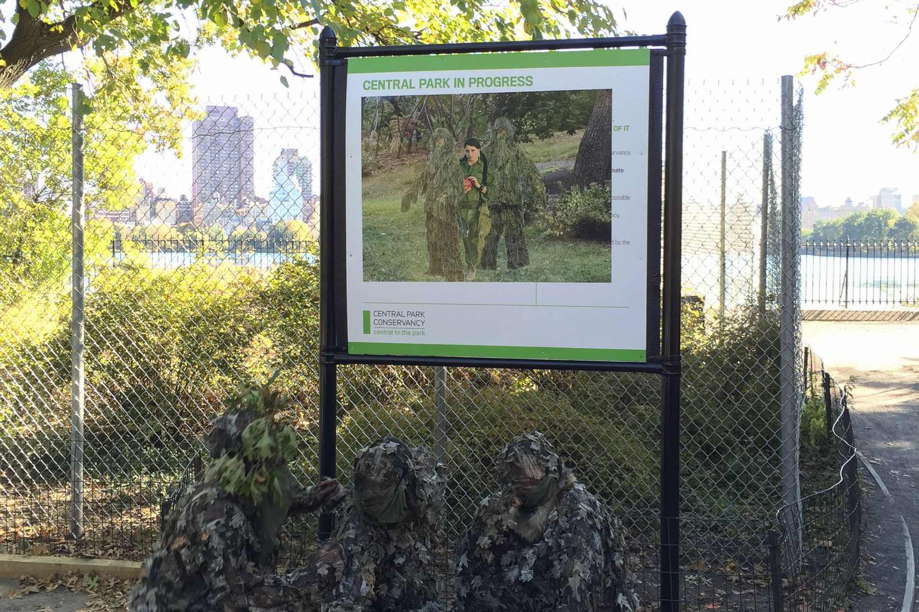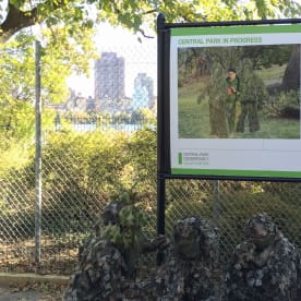 Central Park in Progress 2014 - Digital print on low-tack adhesive vinyl, permanent sign structure, 3 no. 3D-leafy full suits