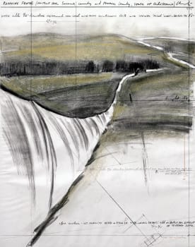Christo Running Fence (Project for Sonoma County and Marin County, State of California) Drawing 1975 Pencil, charcoal and ball-point pen 28 x 22" (71 x 56 cm) Photo: Wolfgang Volz © 1975 Christo