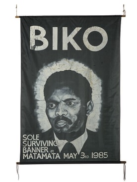 ‘Biko’ banner, 1981/1985. Made by Graeme Easte. Te Papa (GH017813).