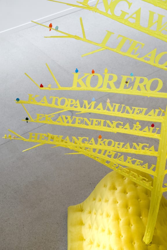 3e. Saffronn Te Ratana (born 1975). Whakarongo ki te karanga (detail) (2014), acrylic paint, fabric, wood, fibre, steel pins. Collection of the artist.