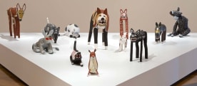 1d. Jack Bell, Craig Koomeeta, David Marpoondin, Garry Namponan, Leigh Namponan, Keith Wikmunea, Roderick Yunkaporta; Wik-Mungkan / Wik-Alkan / Wik-Ngatharr/ Wik-Me’an peoples. Camp Dogs (selection) (2010), carved milkwood (Alstonia muellerana) with natural pigments, charcoal and acrylic binder. Queensland Art Gallery, purchased 2010 with funds from the Josephine Ulrick and Win Schubert Diversity Foundation through the Queensland Art Gallery Foundation.