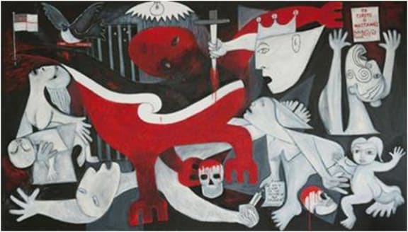 3c. Robyn Kahukiwa (born 1938), Ngāti Porou, Te Aitanga-a-Hauiti, Ngāti Konohi, Te Whanau a Ruataupare, New Zealand. War (2012), acrylic and oil on canvas. Private collection, Auckland.