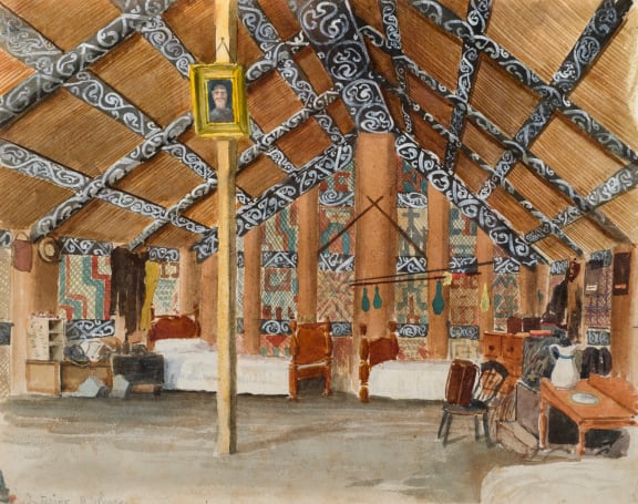 3b. Thomas Ryan (1864–1927), New Zealand, England. Interior of a Whare (c1891), watercolour on paper. Auckland Art Gallery Toi o Tāmaki, purchased 2004.