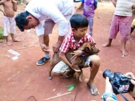 Cambodia is a Buddhist society where monks are revered. After blessing someone, a monk will place a red string around their wrist for good fortune. Sary, the man giving the vaccination, suggested we use blessed red cords as collars for the vaccinated dogs to bring good fortune to the dog and the family, which owners love.