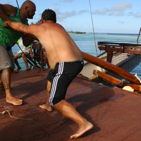 Vaka voyagers and the vaka themselves were instrumental in spreading tatau patterns throughout the Pacific. Thomas Tarurongo Wynne (left) helps steer the vaka out of Avana passage. Photo RNZ/Daniela Maoate-Cox