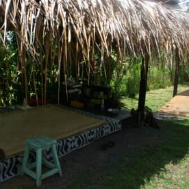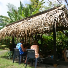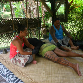 A breeze rustles through the thatched roof and a rooster’s crow floats over the riddims of Bob Marley and the tapping of tatau tools.