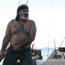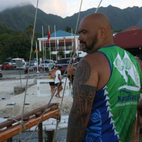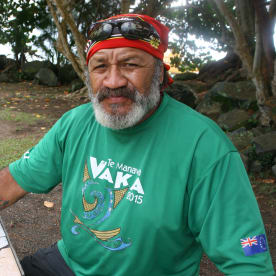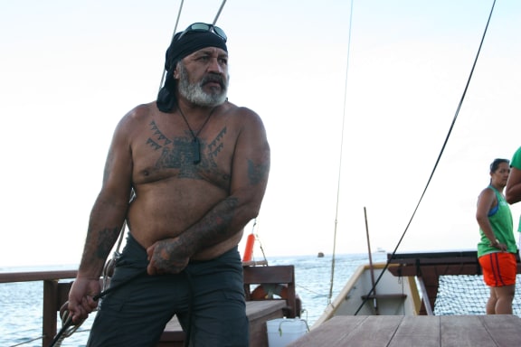 These days Tetini Pekepo is more interested in sailing than practicing tatau. Here he is captaining the Marumaru Atua vaka. Photo RNZ/Daniela Maoate-Cox
