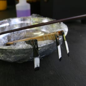 Hands in black pull the skin tight as fine bone points pierce it with ink.
