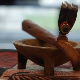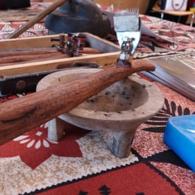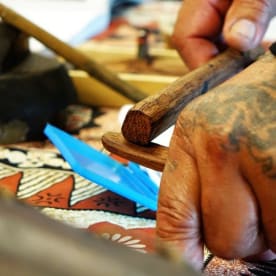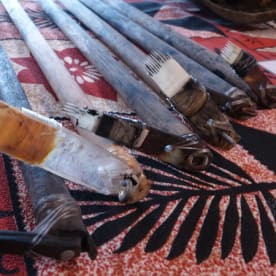Tatau artists Croc's tools are made and maintained by him using wood, fishing wire, and the tusk of a pig for the head. Photo RNZ/Daniela Maoate-Cox